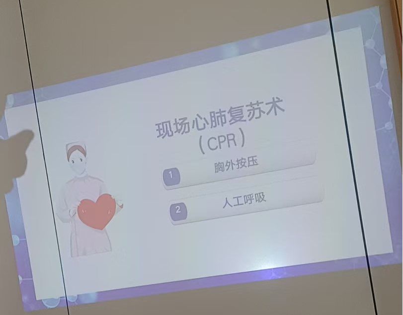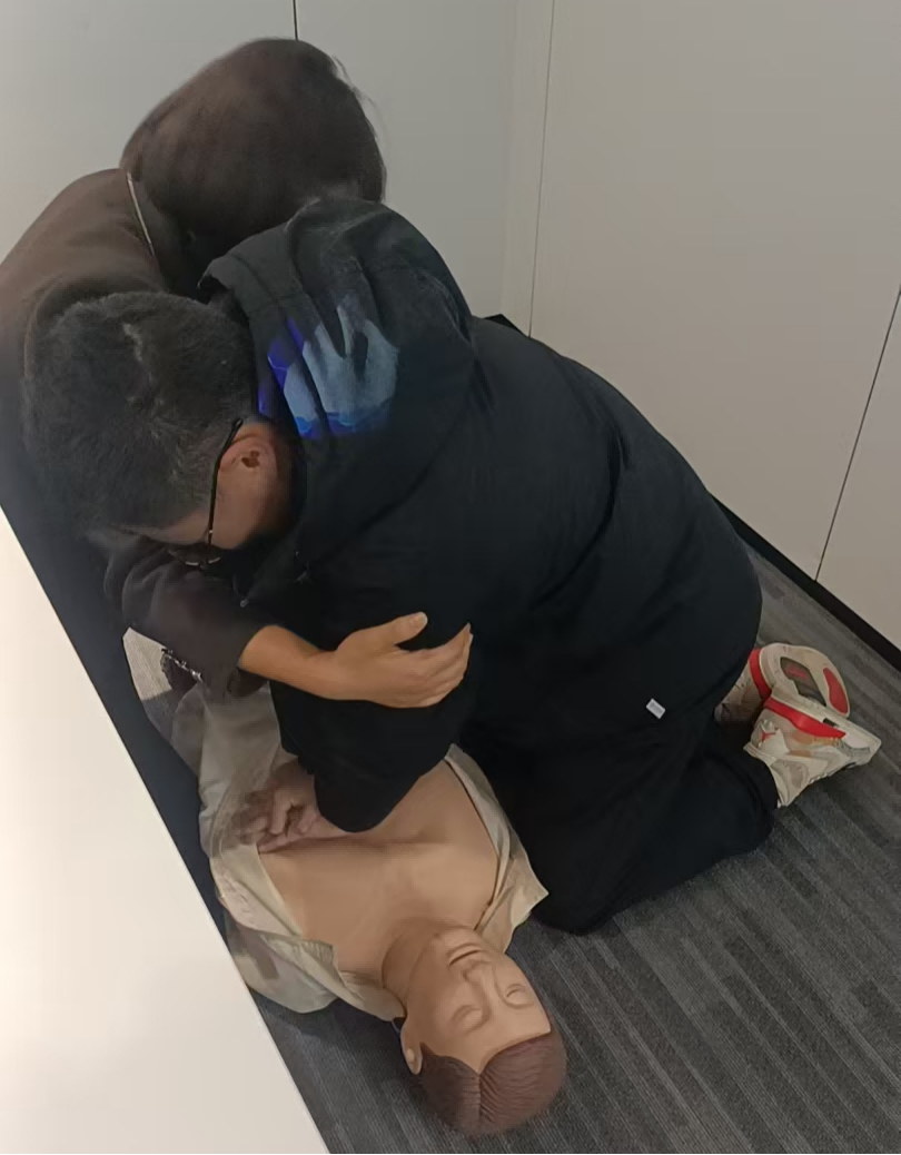 在突发事件应急处理方面,老师介绍了CPR现场紧急救护的方法,包含胸外按压和人工呼吸,老师亲自教学其动作,员工一一进行实操演练。